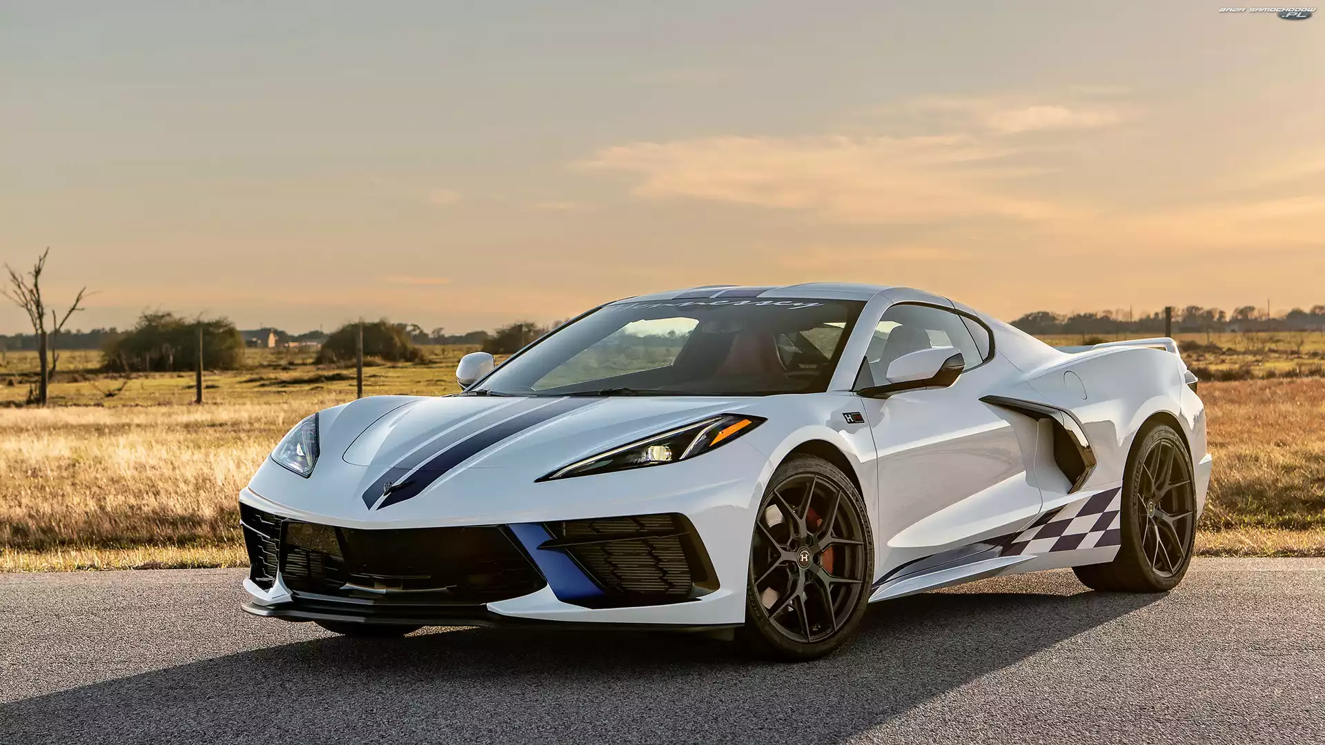 Samochód: Łąka, Pobocze, Niebo, Chevrolet C8 Corvette Stingray, 2023, Hennessey Supercharge H700, Przód, Biały
