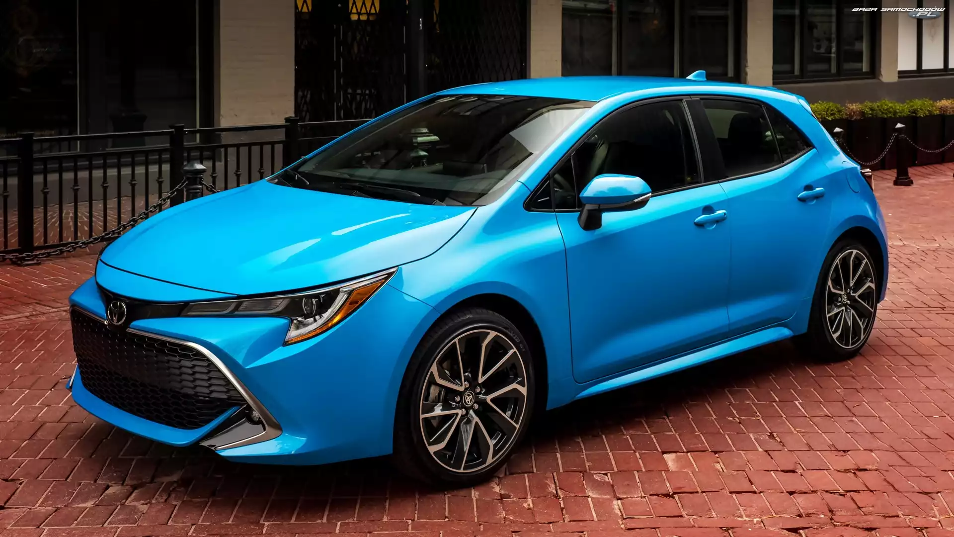 Toyota Corolla Hatchback, Domy, Niebieska, Ulica- Zdjęcia samochodów